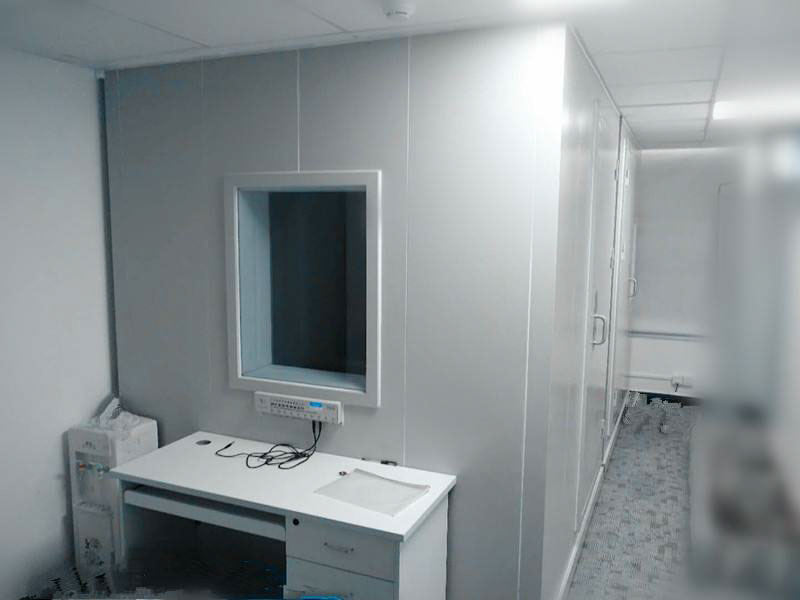 隔聲門:齊平安裝凸輪提升合頁,磁性密封,隔聲門板的內(nèi)外棉使用冷軋鋼板制造,門側(cè)、門頂與門框裝有兩套詞性壓縮密封帶,當(dāng)門處于關(guān)閉位置時形成隔聲環(huán)。門板底部是在門關(guān)閉時能使門緊壓地板的重力作用密封條,不采用門檻式密封。隔音窗為具有壓力密封的鋁型材窗框結(jié)構(gòu),使用雙層夾膠安全玻璃窗。接線系統(tǒng)、照明系統(tǒng)、通風(fēng)系統(tǒng)都會按照客戶要求而配置。